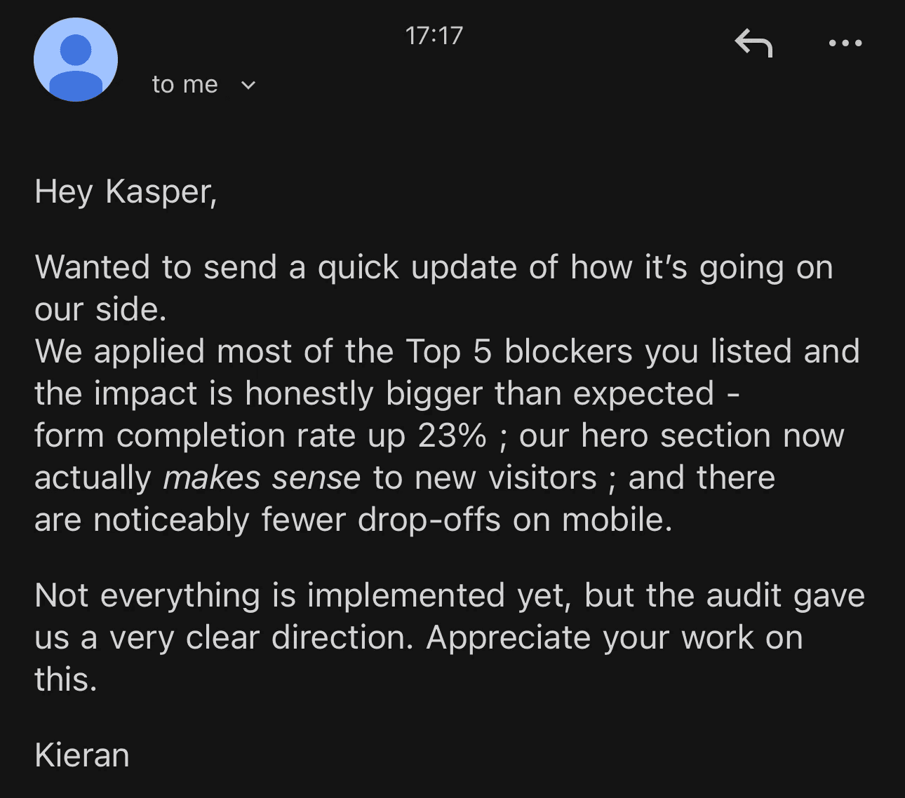 You get a Loom video where I go section by section through your page and talk through the exact moments where people stop, hesitate or click away - so you can finally see why your numbers are stuck at 2-3%.