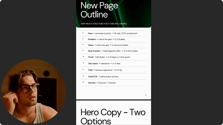 You get a concrete “do this next” plan, not theory: a full teardown of your page, a prioritized list of fixes, improved hero options, and a 12-15 minute Loom walkthrough. The idea is that you (or your team) can open the report and know exactly what to change this week to move conversions.
