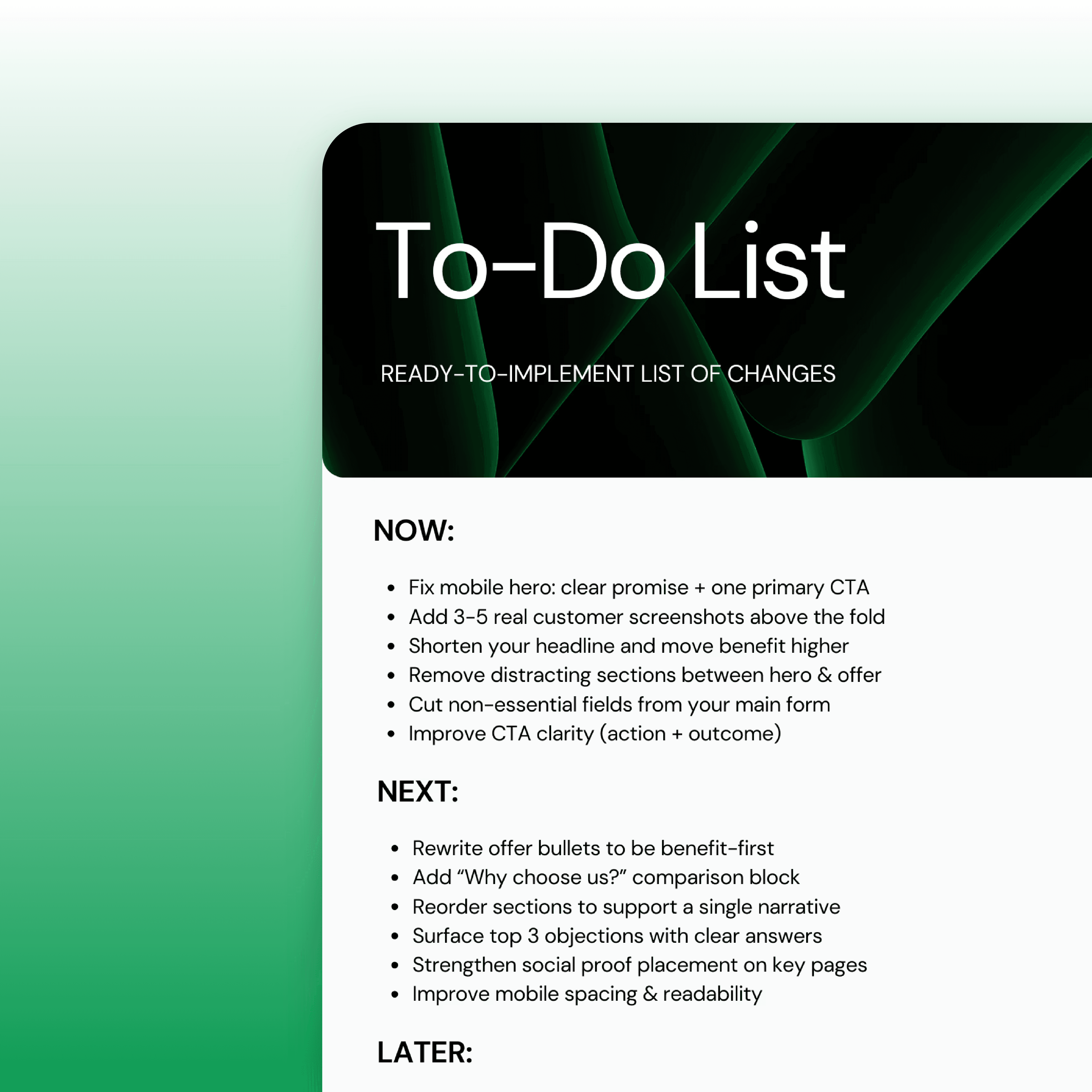 You walk away with a clear picture of the biggest leaks and a ranked list of moves that can close that gap - whether you use the audit as your next sprint plan or as the starting brief for a stronger rebuild and ongoing CRO.