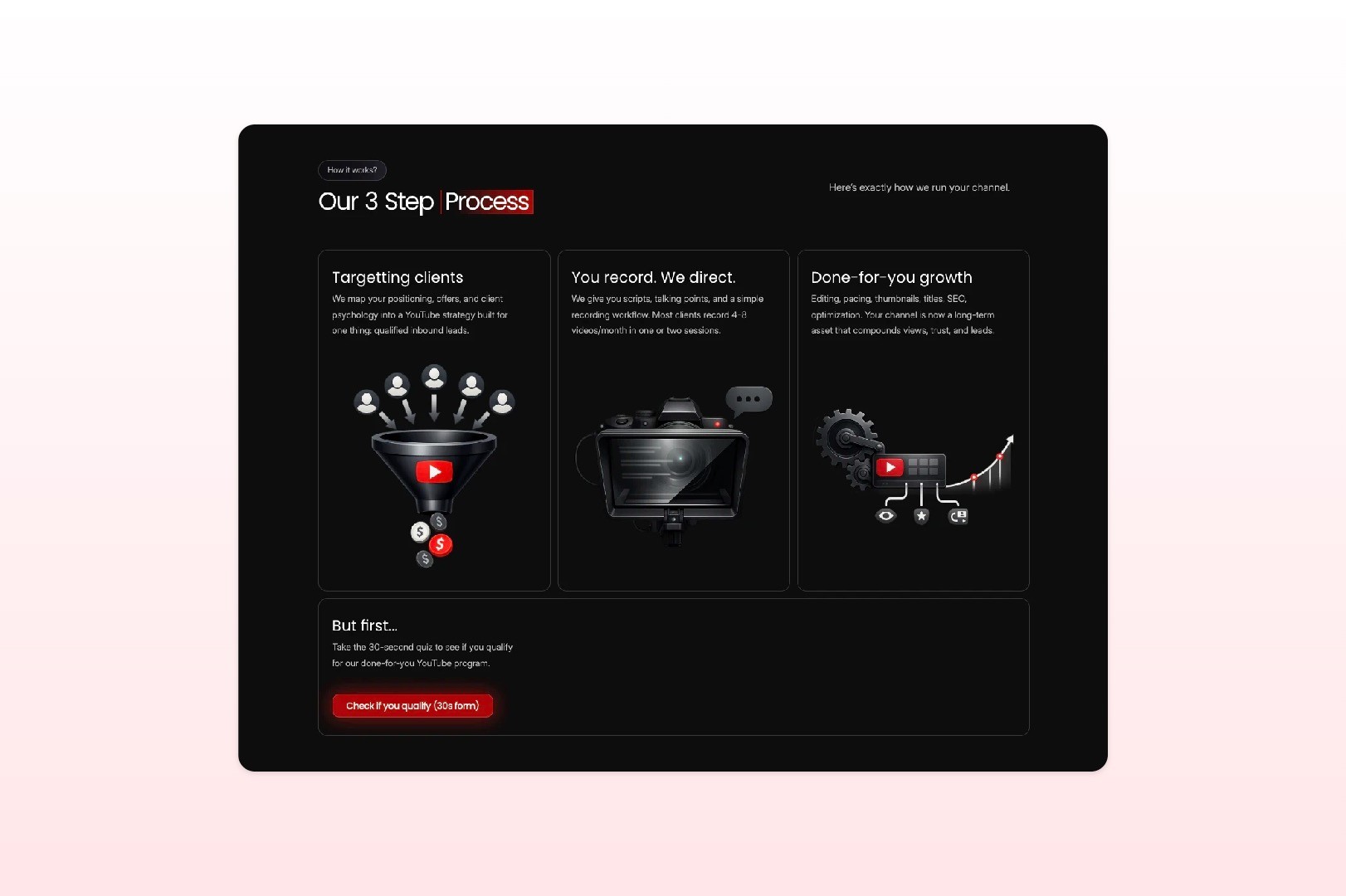 First, we rebuilt the landing page itself to make the offer clearer, the process easier to follow and the decision path much more focused. The new page puts more emphasis on clarity, visual quality and conversion logic — with stronger structure, clearer sections and a much more intentional journey from first impression to booked call.