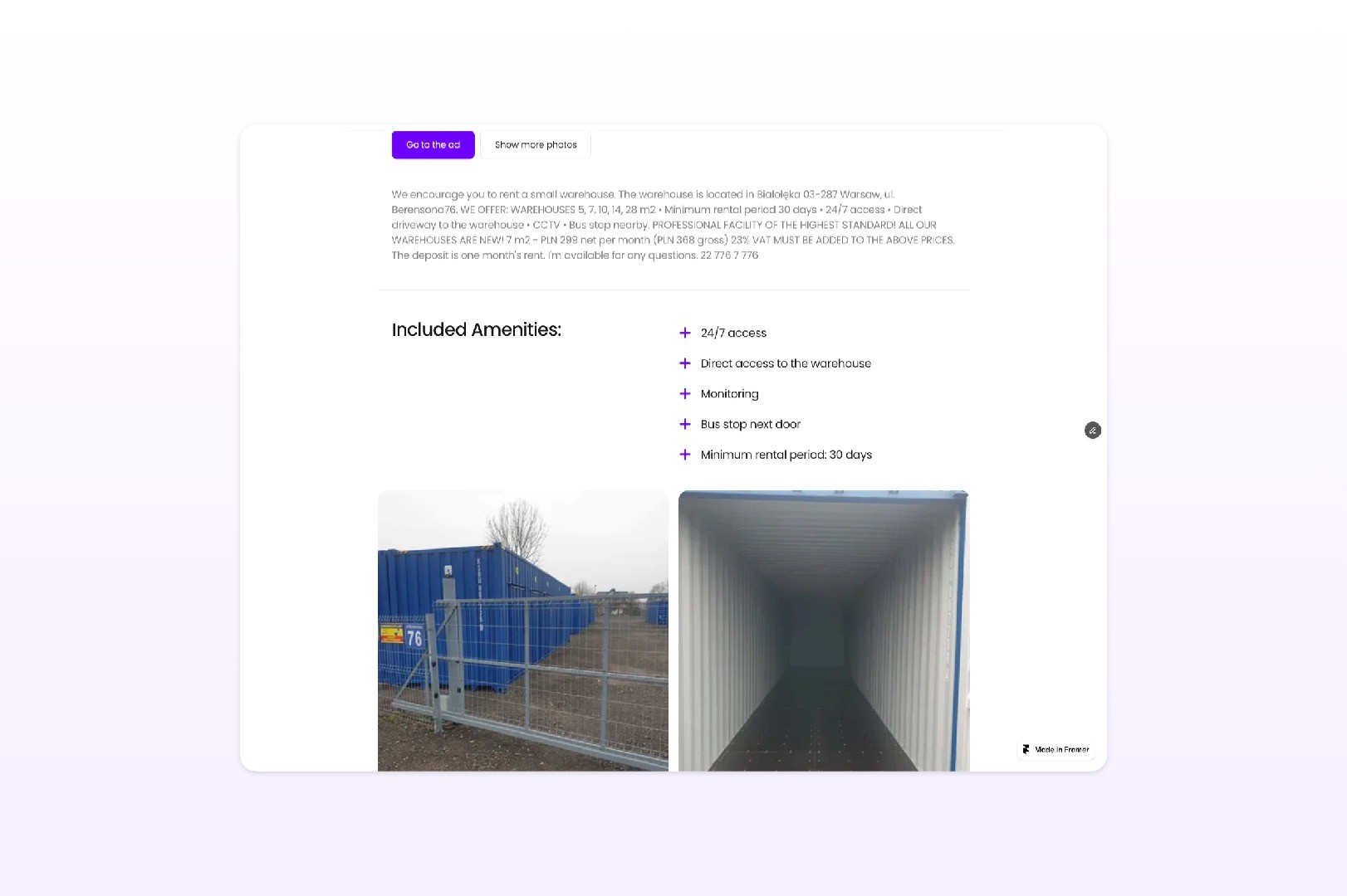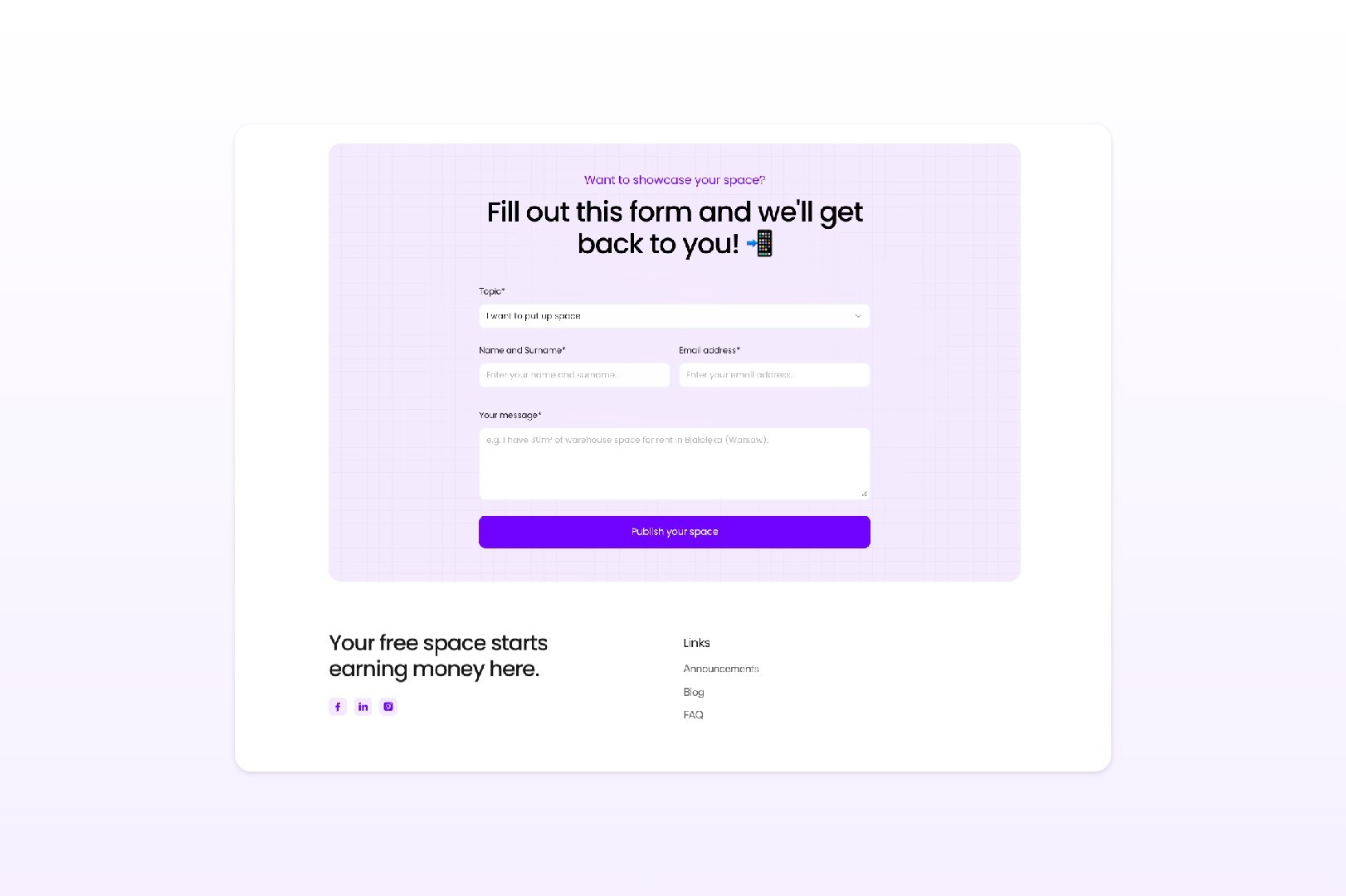 The platform gives users a way to browse available spaces for rent, compare key listing details and move deeper into full offer pages that explain the property more clearly — including pricing, size, address and selected amenities. At the same time, owners can use a dedicated submission flow to publish their own space and enter the marketplace without unnecessary friction. These elements are visible today through the listing previews, full offer entries, FAQ and the “Opublikuj przestrzeń” form on the live site.