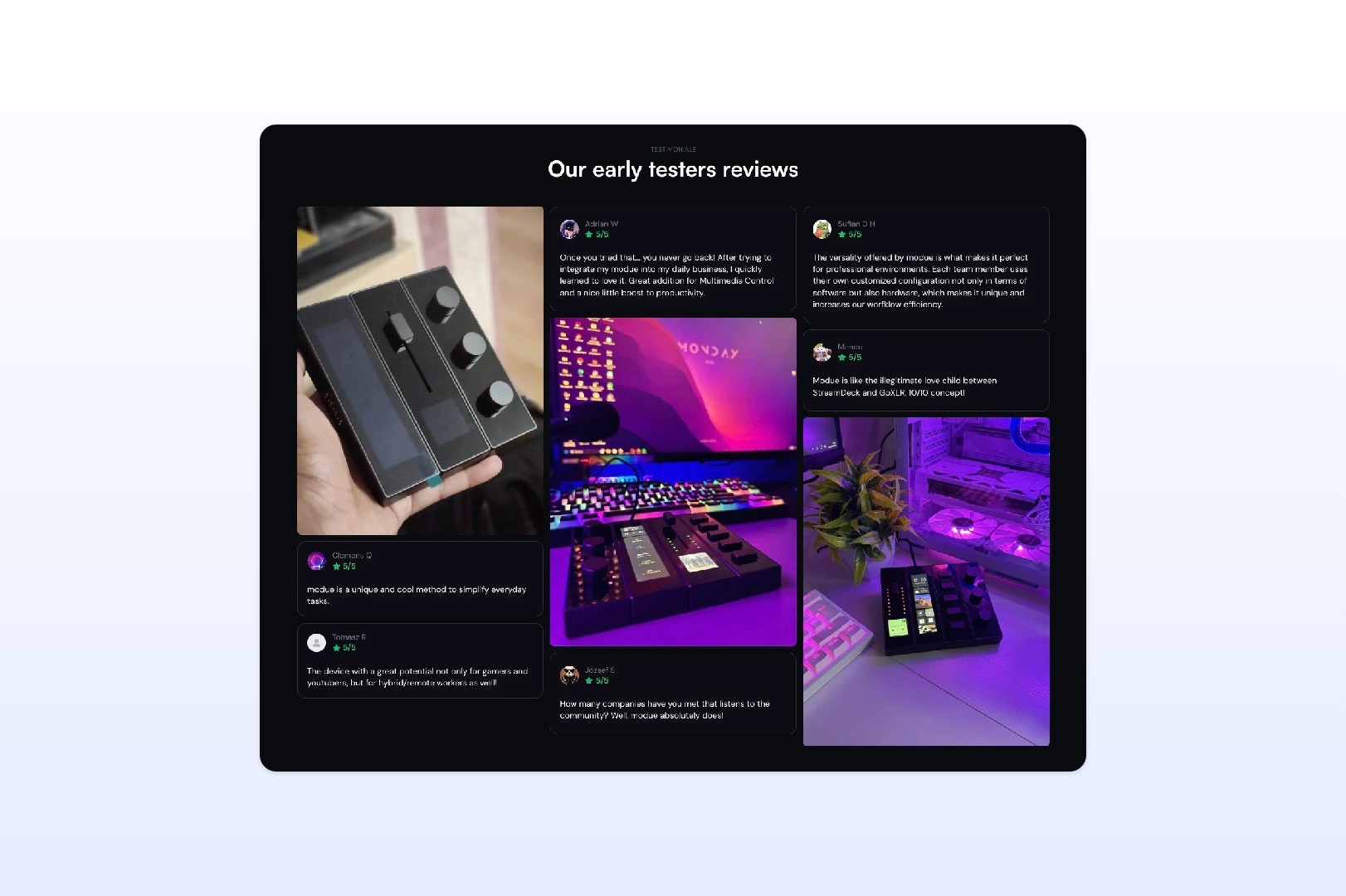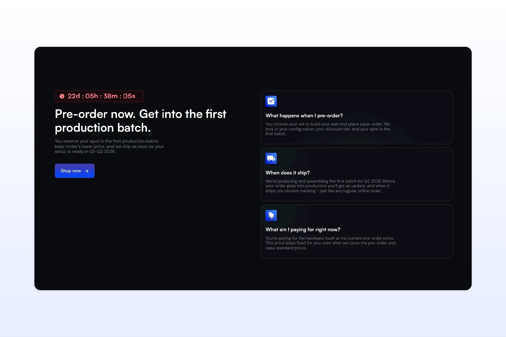 Beyond the core journey, we also reworked the supporting structure of the page: clearer feature presentation, stronger segmentation by user type, a more understandable pre-order explanation, new FAQ, testimonials and a stronger final CTA. At the same time, we unified the visual language of the site so every section finally felt like part of one coherent system.