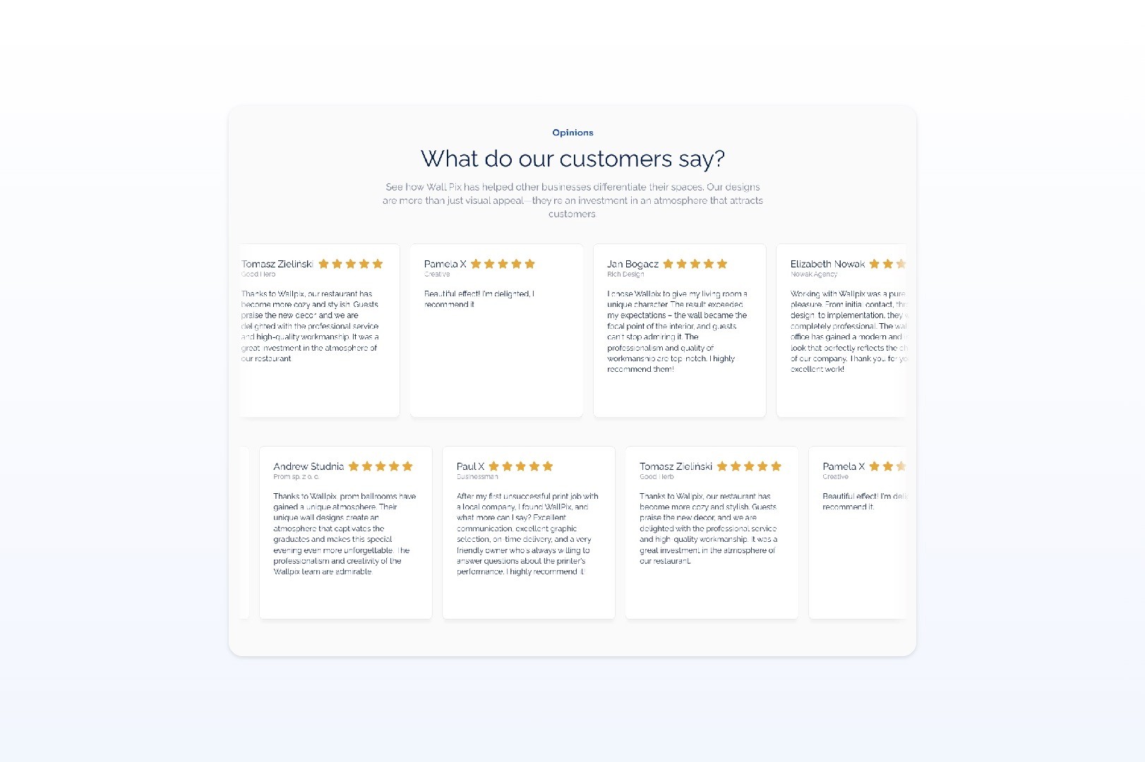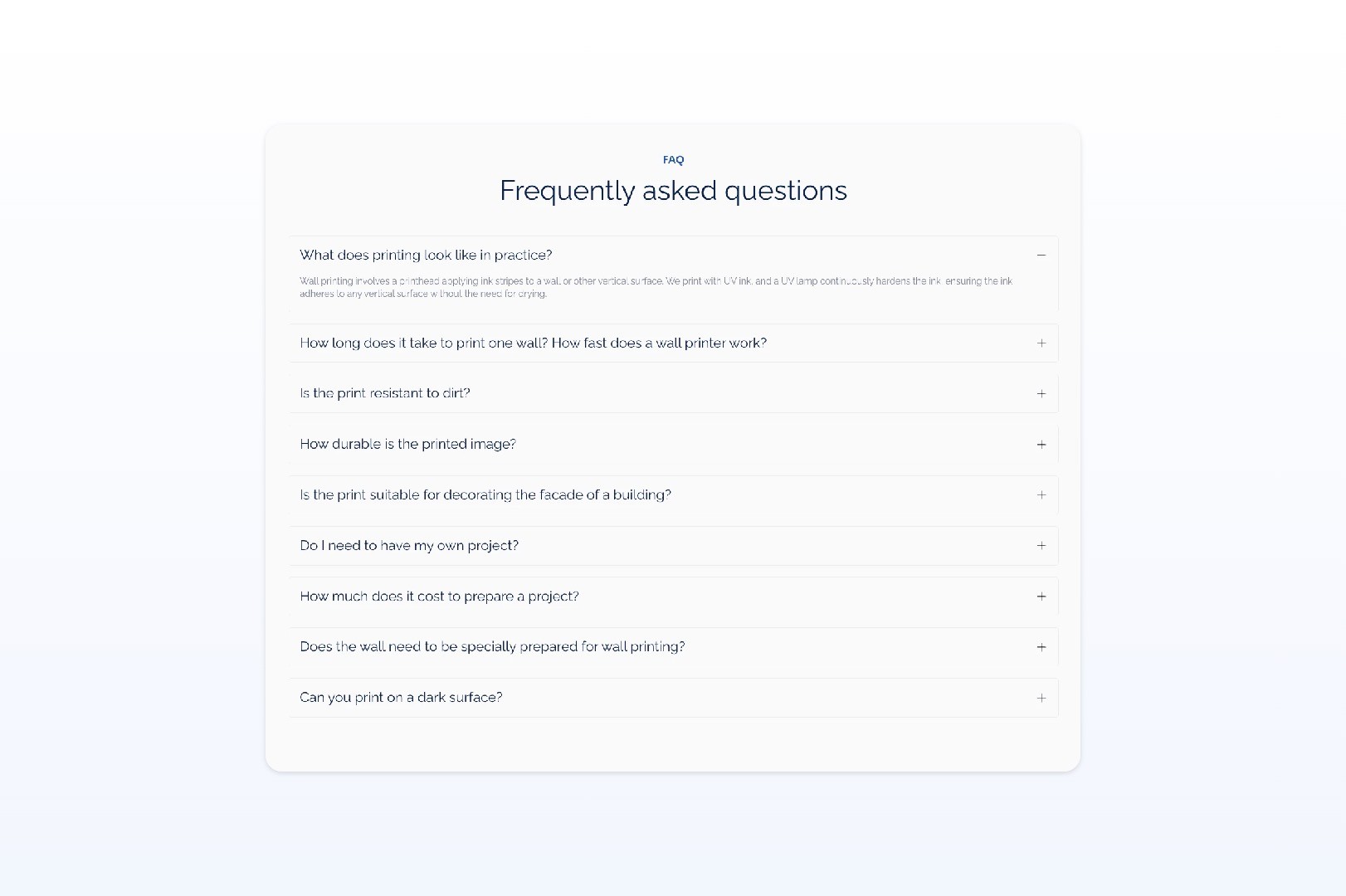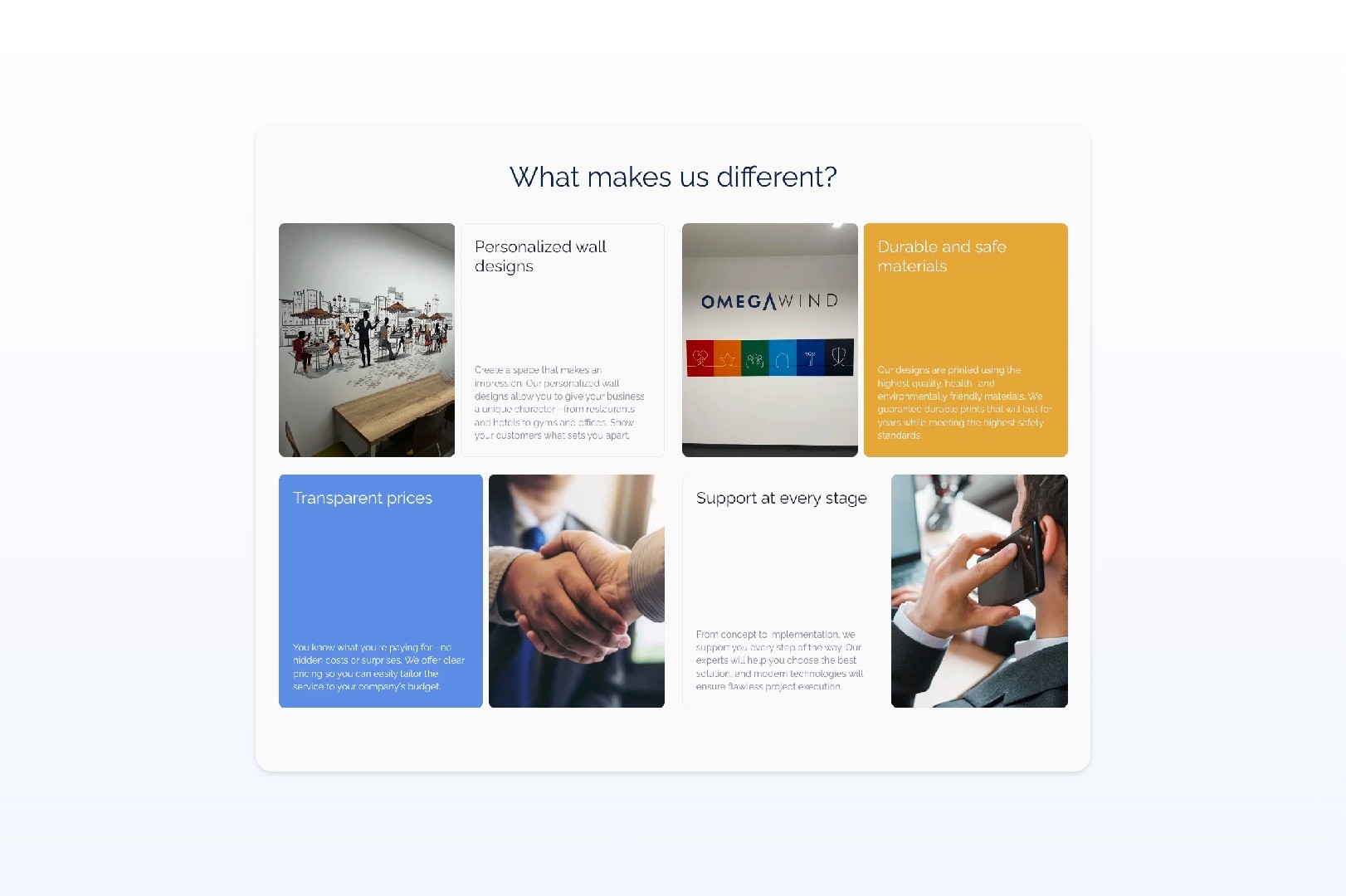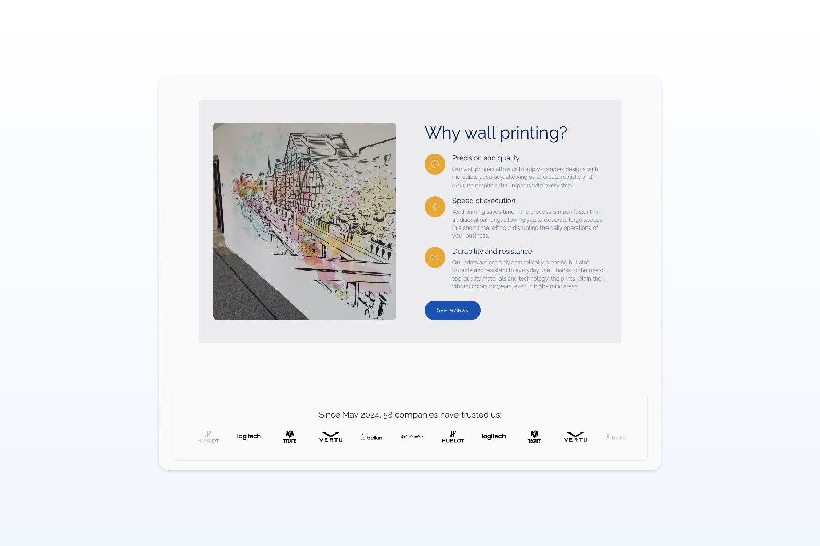 Wall printing is not yet a service that most business owners instantly understand. That meant the page had to educate first, but without feeling heavy or overexplained. People needed to quickly understand what the service is, how it works, why it is worth considering and what kind of effect they can expect in their space.